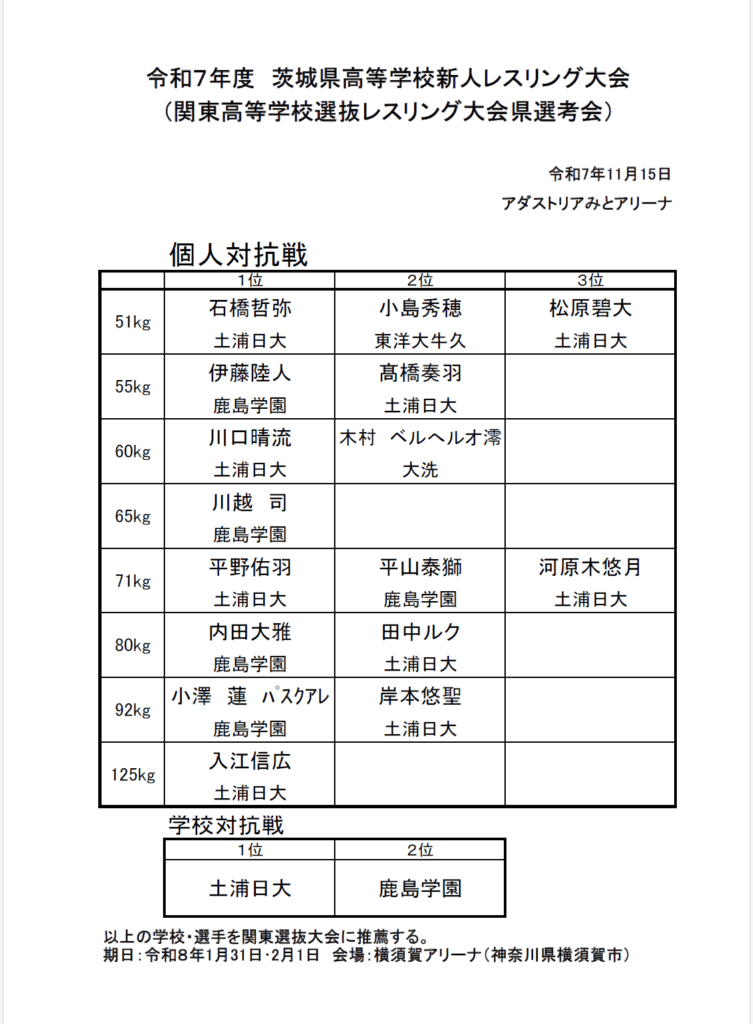11月15日(土)、にアダストリアみとアリーナレスリング場でおこなわれた「令和7年度 茨城県高等学校新人レスリング大会 関東高等学校選抜レスリング大会県選考会」の結果は以下の通り。