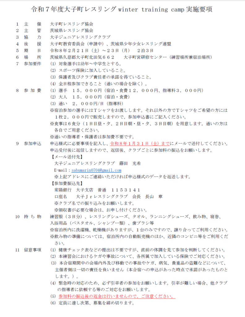 大子町レスリング協会は、以下の日程において幼年から中学生を対象とした強化合宿を実施いたします。