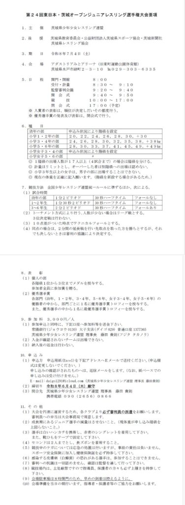 【7/4】第24回東日本・茨城オープンジュニアレスリング選手権大会実施要項 2026.04.27 2026.04.27 Tweet Share Hatena Pocket RSS feedly Pin it 7月4日(土)に茨城県水戸市・アダストリアみとアリーナで行われる第24回東日本・茨城オープンジュニアレスリング選手権大会実施要項および大会申込書は下記の通り。 茨城OP大会要項R8ダウンロード 茨城OP大会申込ダウンロード Tweet Share Hatena Pocket RSS feedly Pin it この記事のタイトルとURLをコピーする 【5/4~5/6】令和7年度大子町レスリングspring training camp開催のお知らせ 前の記事